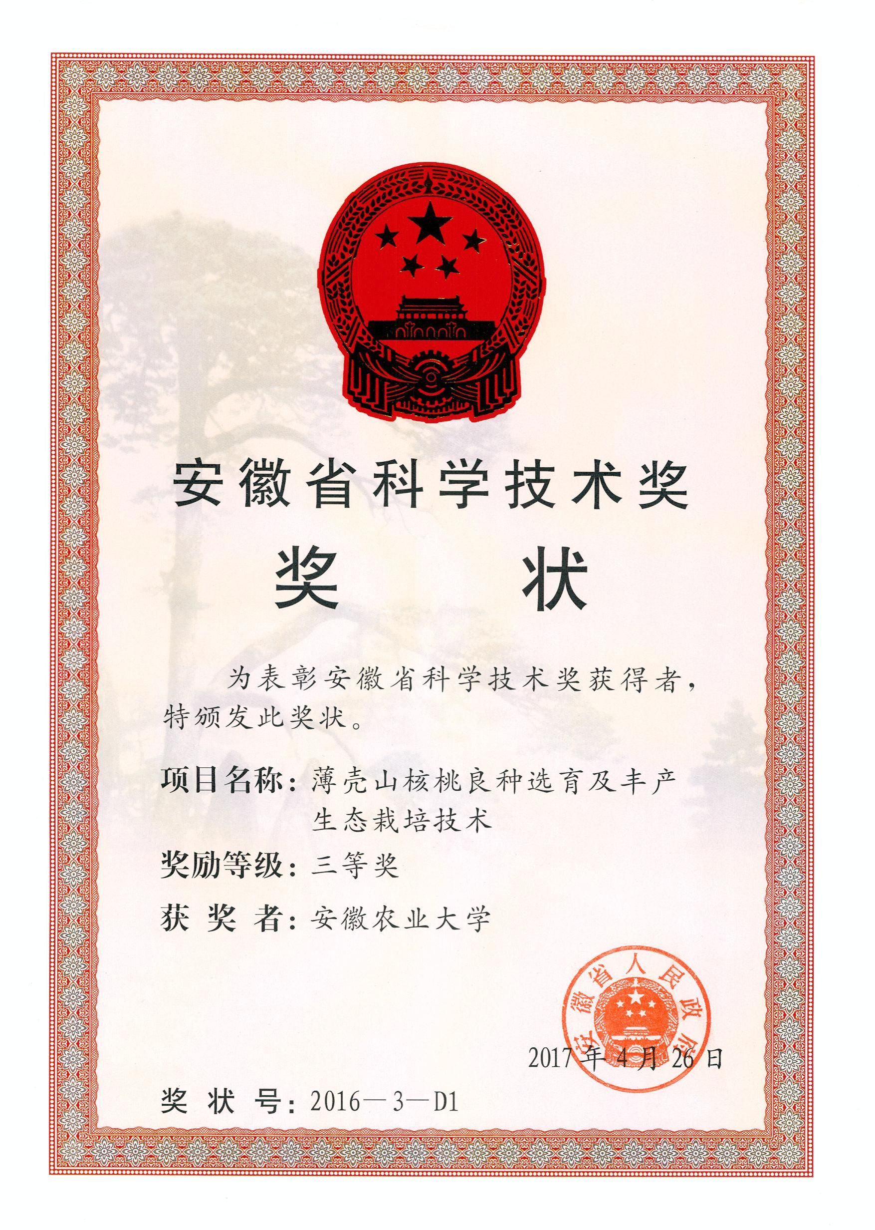安徽省科学技术奖-薄壳山核桃良种选育及丰产生态栽培技术