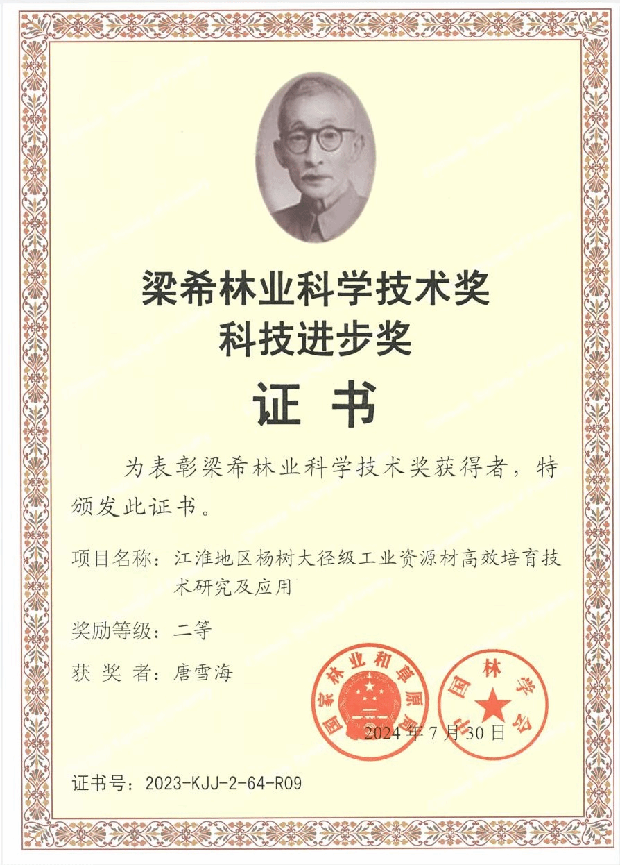 梁希林业科学技术奖-江淮地区杨树大径级工业资源材高效培育技术研究及应用